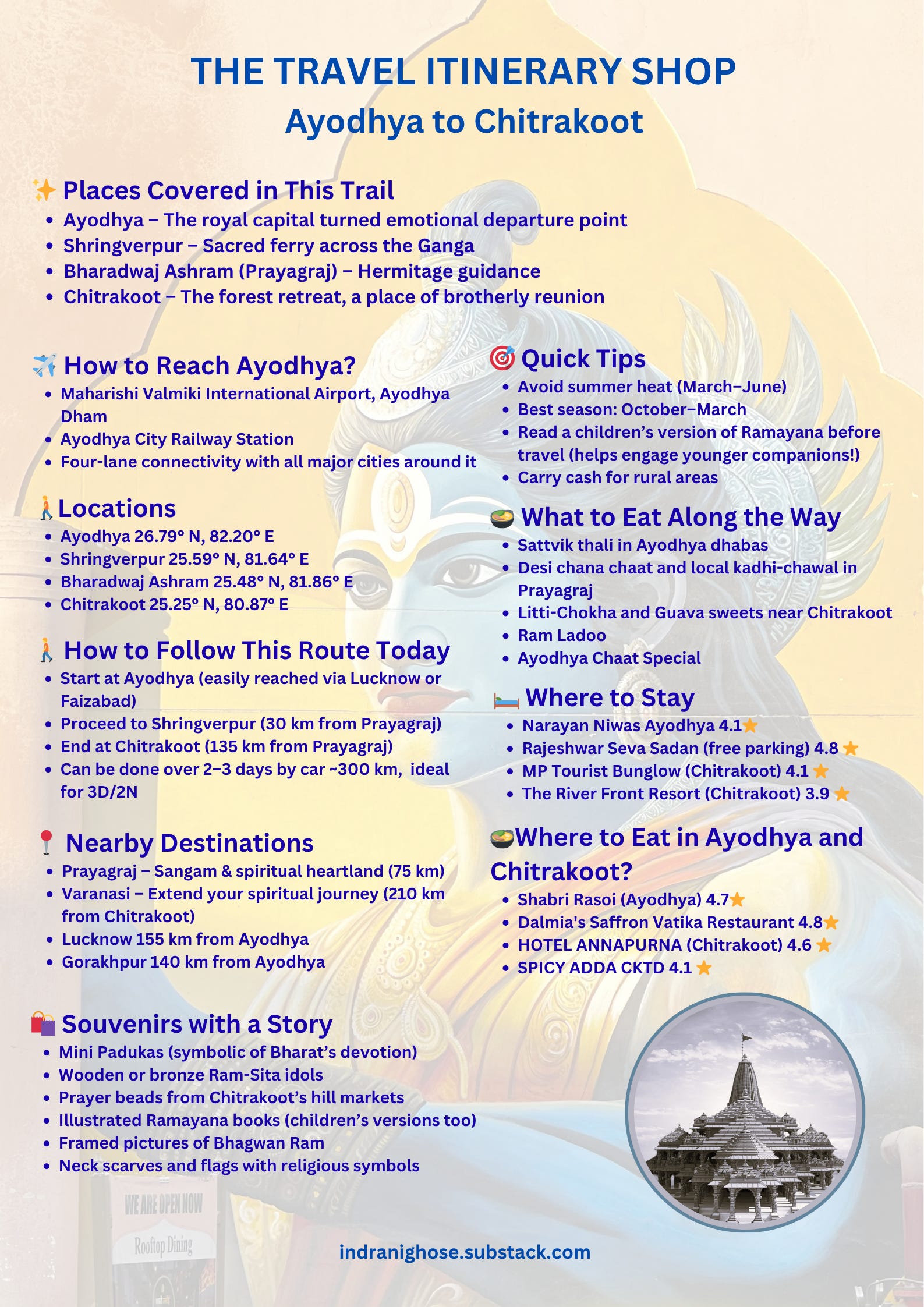 We begin, naturally, at the point of departure: Ayodhya, the city of kings and gods, and follow his footsteps till Chitrakoot, the forested refuge where the exiled prince first found peace—and perhaps acceptance of his fate.
